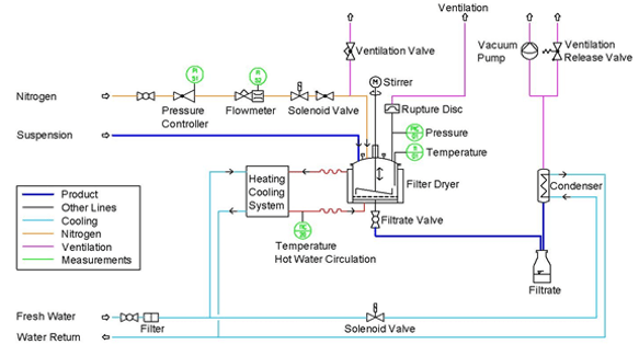 Dieser kombinierte Filter und Trockner besteht aus einem beheizten Mantel mit einer abnehmbaren Filterplatte. Das Rührwerk ist in der Höhe verstellbar und kann zur Unterstützung der Produktentnahme verwendet werden. Es ist nur ein Minimum an manueller Kontrolle erforderlich, da das System die automatische Steuerung von Druck, Vakuum und Temperatur ermöglicht. Das Produkt kann durch Kippen des Filtertrockners leicht entnommen und anschließend luftdicht in einzelne Beutel verpackt werden.