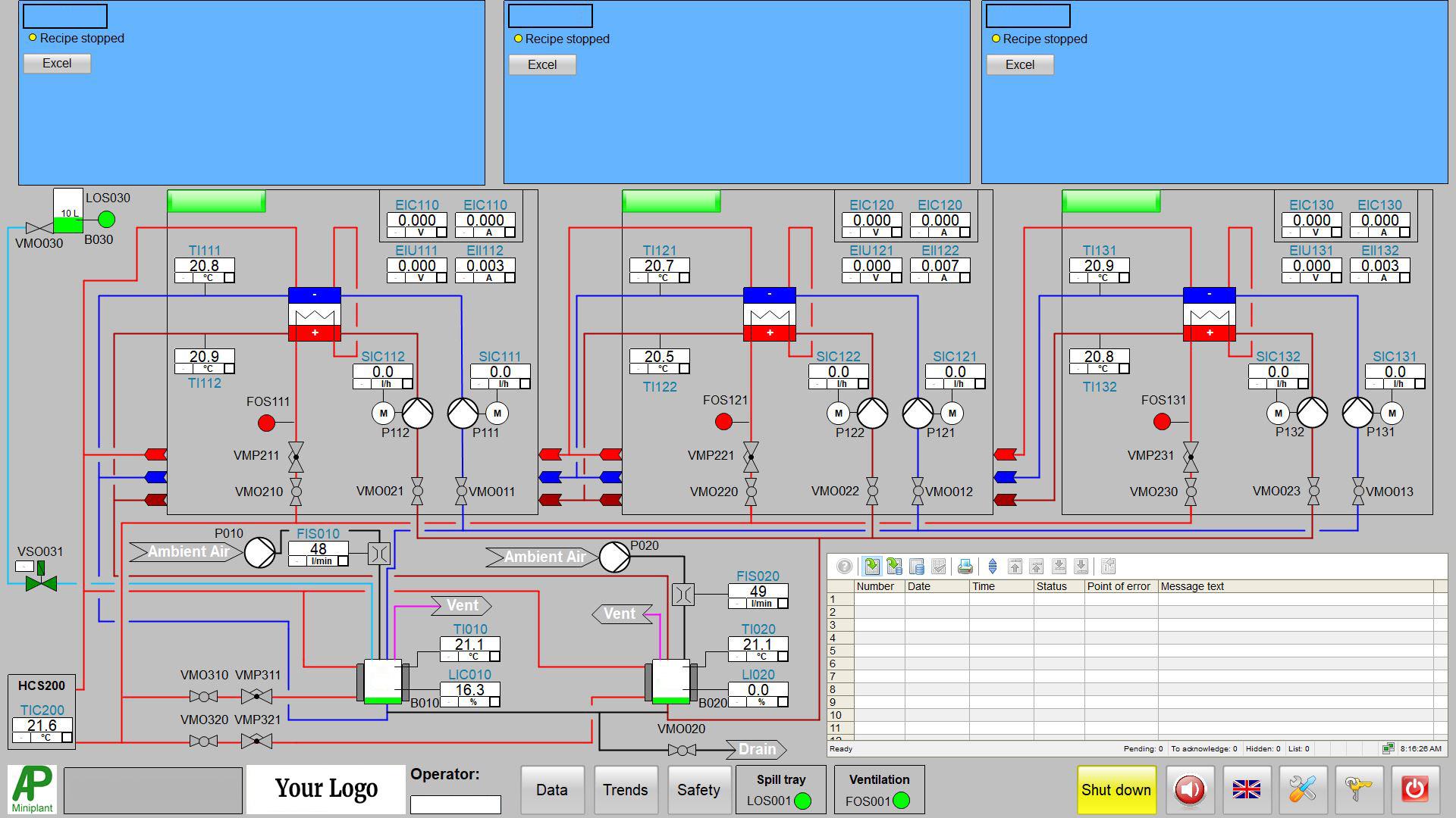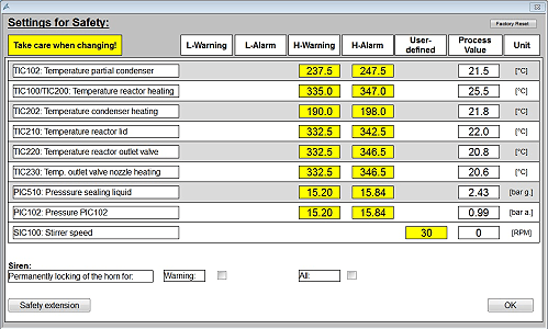 Die Programmsteuerung erfolgt standardmäßig PC-basiert in Kombination mit dem industriellen Bedienprogramm SimaticWinCC. Die Bedienoberfläche ist visuell am Anlagenfließbild orientiert, so dass Prozessparameter intuitiv und schnell verändert werden können. Kritische Prozesszustände werden durch definierte Sicherheitsbedingungen und Alarmgrenzen vermieden.